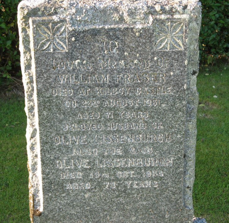 In/loving memory of/WILLIAM FRASER/died at Kilcoy Castle/on 22nd August 1961/aged 71 years/beloved husband of/OLOVE LISSENBURGH/also the said/OLIVE LISSENBURGH/died 16th Oct. 1964/aged 73 years.