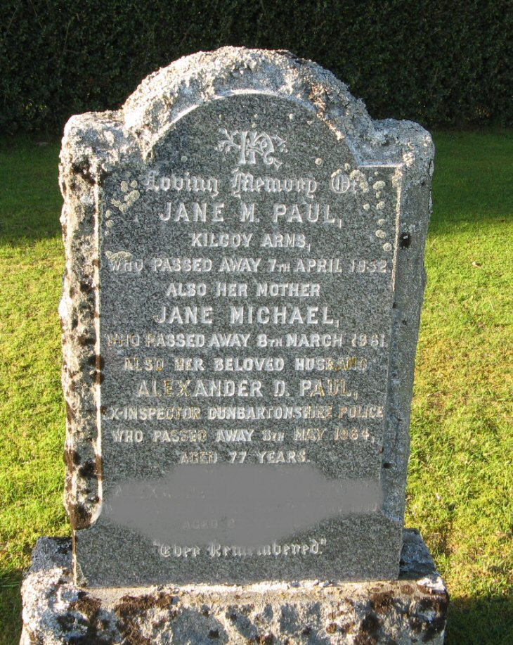 In/loving memory of/JANE M. PAUL/Kilcoy Arms/who passed away 7th April 1952/also her mother/JANE MICHAEL/who passed away 6th March 1961/also her beloved husband/ALEXANDER D. PAUL/ex-inspector Dunbartonshire police/who passed away 8th May 1964/aged 77 years/["recent"].