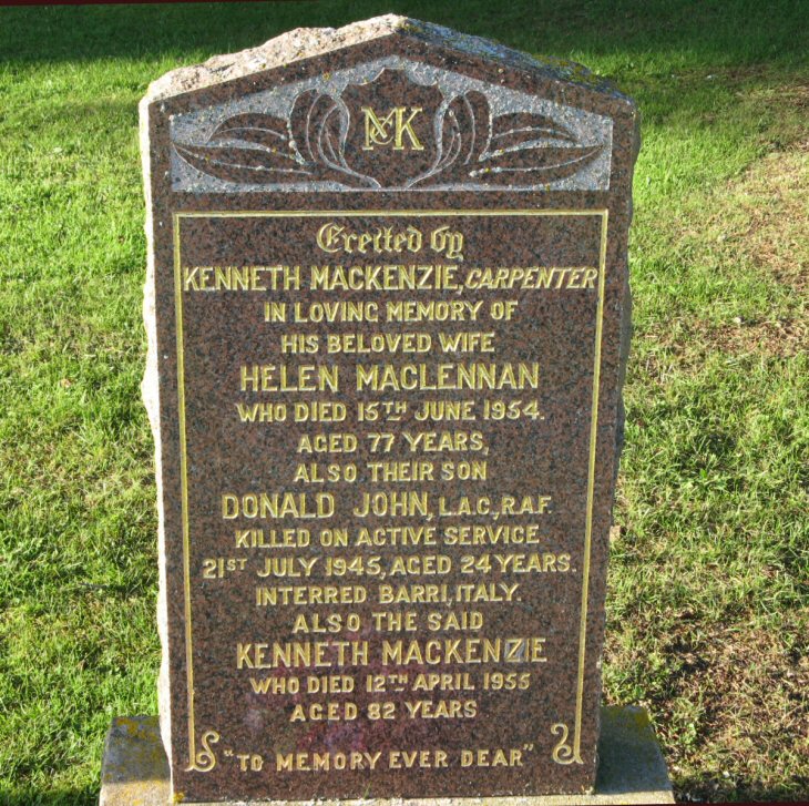 Erected by/KENNETH MACKENZIE, carpenter/in loving memory of/his beloved wife/HELEN MACLENNAN/who died 15th June 1954/aged 77 years/also their son/DONALD JOHN, LAC, RAF/killed on active service/21st July 1945, aged 24 years/interred Barri, Italy/also the said/KENNETH MACKENZIE/who died 12th April 1955/aged 82 years.