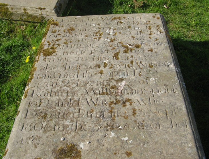 DONALD WATSON/indweller & farmer/in Cromarty died 11th/of January 1780 in the/47th year of his age/KATHRENE WILLIAMSON/his relict placed this/stone to his memory/also their son DAVID WATSON/who died the 1 April 1793/aged 24 years also/KATHRENE WILLIAMSON spouse/to DONALD WATSON who/departed this life 15th Sept./1806 in the 74th year of her/age.