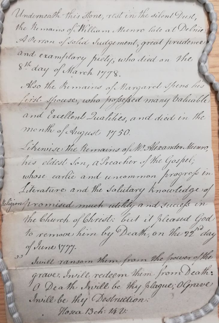 Underneath this stone resting in silent dust the remains of WILLIAM MUNRO, late of Delnies, a person of solid judgement and great prudence and exemplary piety who died on the 8th day of March 1778; also the remains of MARGARET SPENS, his first spouse, who possessed many valuable excellent qualities and died in the month of August 1750; likewise the remains of Mr ALEXANDER MUNRO, his elder son*, a preacher of the Gospel whose earlie and uncommon progress in literature and the salutary knowledge of religion promised much ability** in the Church of Christ but it pleased God to remove him by death on the 22nd day of June 1777: "I will ransom them from the power of the grave; I will redeem them from death; O death, I will be thy plagues; O grave, I will be thy destruction:repentance shall be hid from mine eyes***." Hosea Ch13 V14